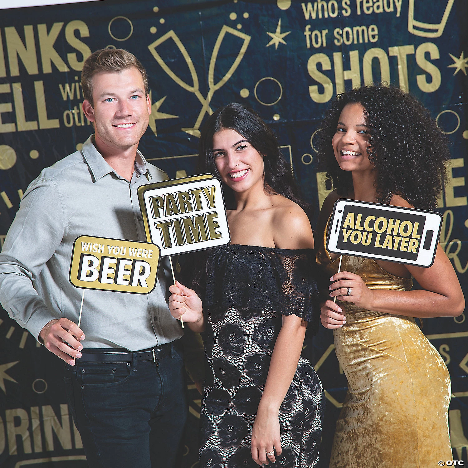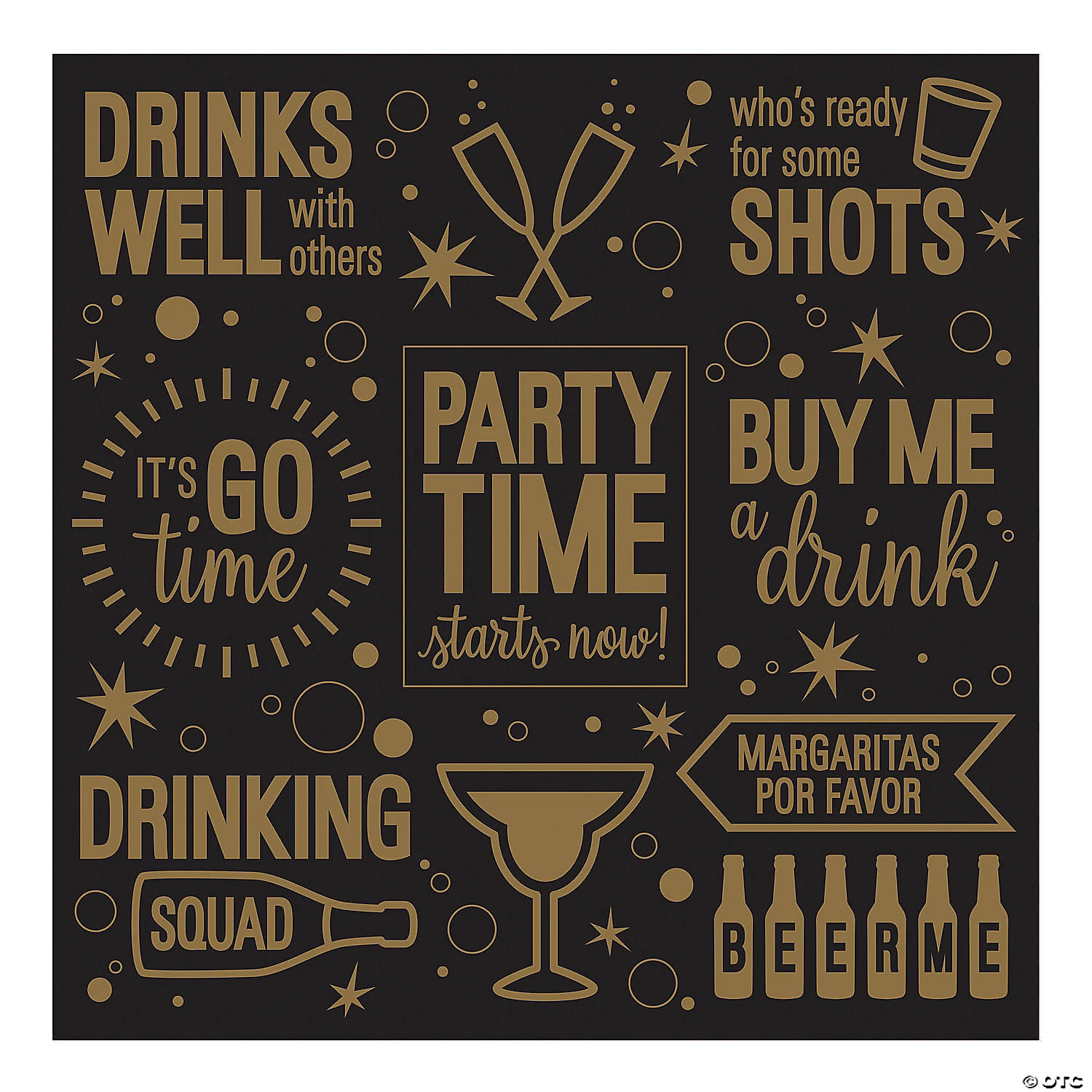 This party decoration makes a fun backdrop for a DIY photo booth! Whether it’s an adult’s birthday party, a New Year’s Eve party or just a celebration, this fun banner features assorted funny phrases about drinking. Some phrases include: drinks well with others, who’s ready for some shots, and drinking squad. Plastic. 6 ft. x 6 ft. © OTC