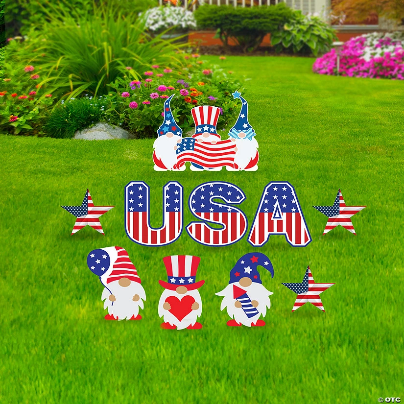 Who knew gnomes were so patriotic? This impressive yard sign set is a great way to show off USA pride on the Fourth of July or any other patriotic holiday. This assortment of yard stakes creates a silly and patriotic scene in your front yard that will impress neighbors and let the community know that yours is a patriotic household. Corrugated plastic. (10 pcs. per unit) Each approx. 15″ x 17″. Simple assembly required.