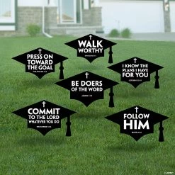 Whether you’re a private school getting ready for graduation, or your child is graduating from a religious school, these inspirational yard signs are the perfect addition to outdoor graduation party decorations. Each mortarboard features a quote from the Bible. Includes metal stakes. Corrugated plastic. (6 pcs. per unit) 17″ x 9 1/2″ Simple assembly required. © OTCReligious Graduation Mortarboard Yard Signs Instructions