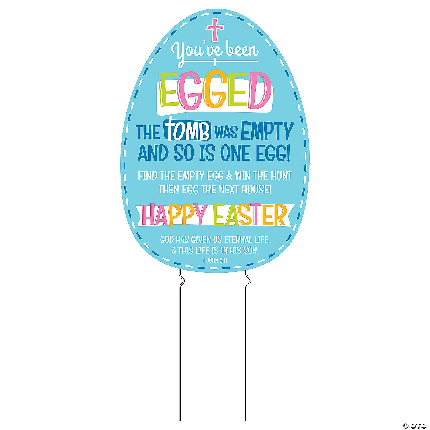 Looking to get into some wholesome mischief around Eastertime? This fun yard sign proclaims a house “egged” and should be displayed in the yard of a house where you place a bunch of Easter eggs. One egg should be empty, just the like tomb on the first Easter Sunday. Neighbors will get a good laugh out of getting “egged” and will likely pass the tradition on to other houses in the neighborhood. Corrugated plastic. Includes metal stakes. Sign is one-sided. 17″ x 30″ Simple assembly required. © OTC