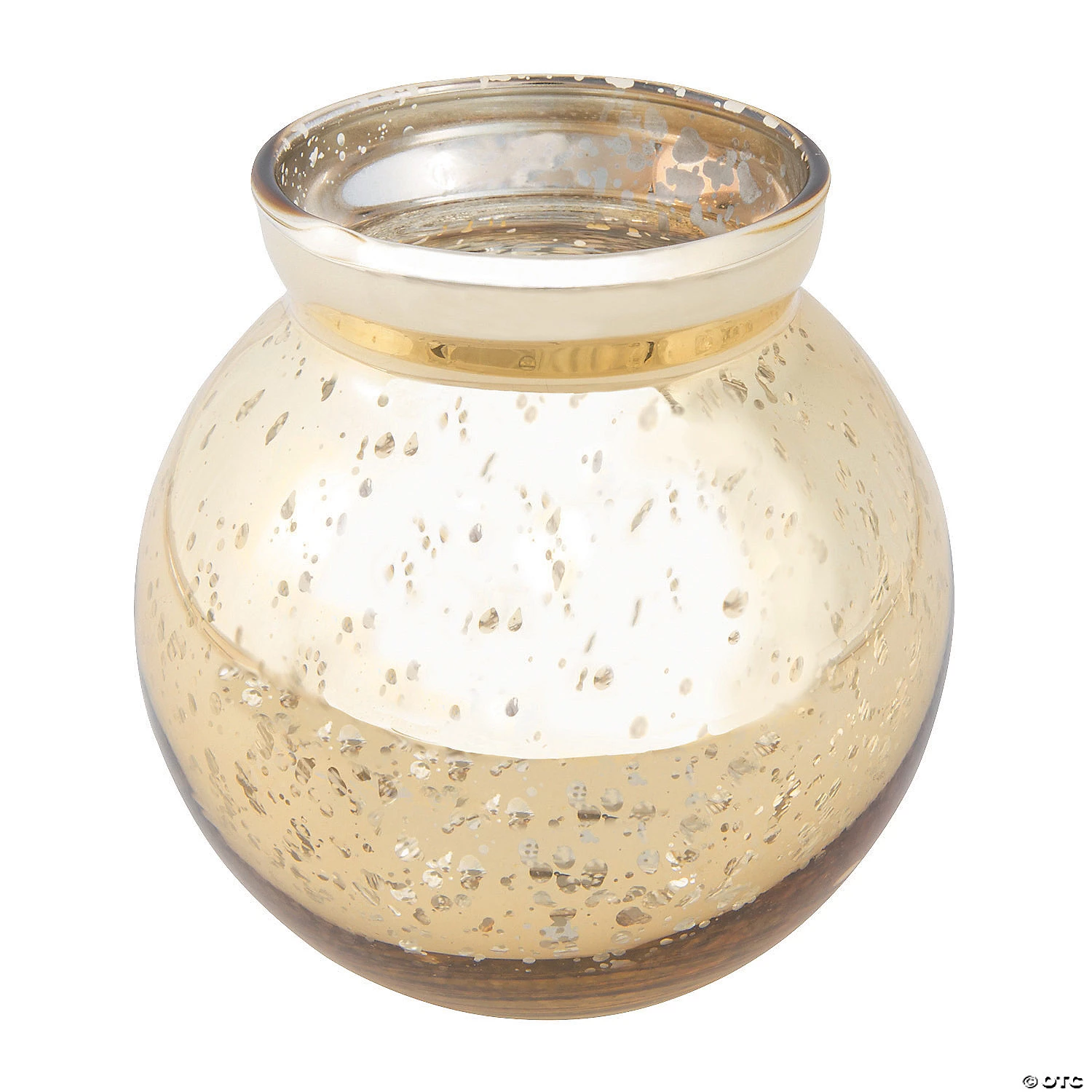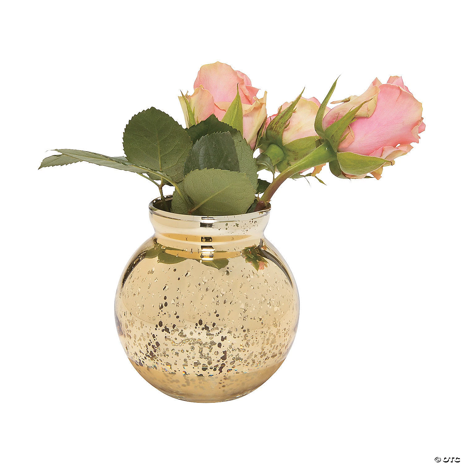 Decorate for your special occasion with these Round Gold Mercury Bud Vases. The perfect addition to your party supplies, these glass vases can be used for wedding receptions, engagement dinners, birthdays and more. (6 pcs. per unit) 4″ diam.