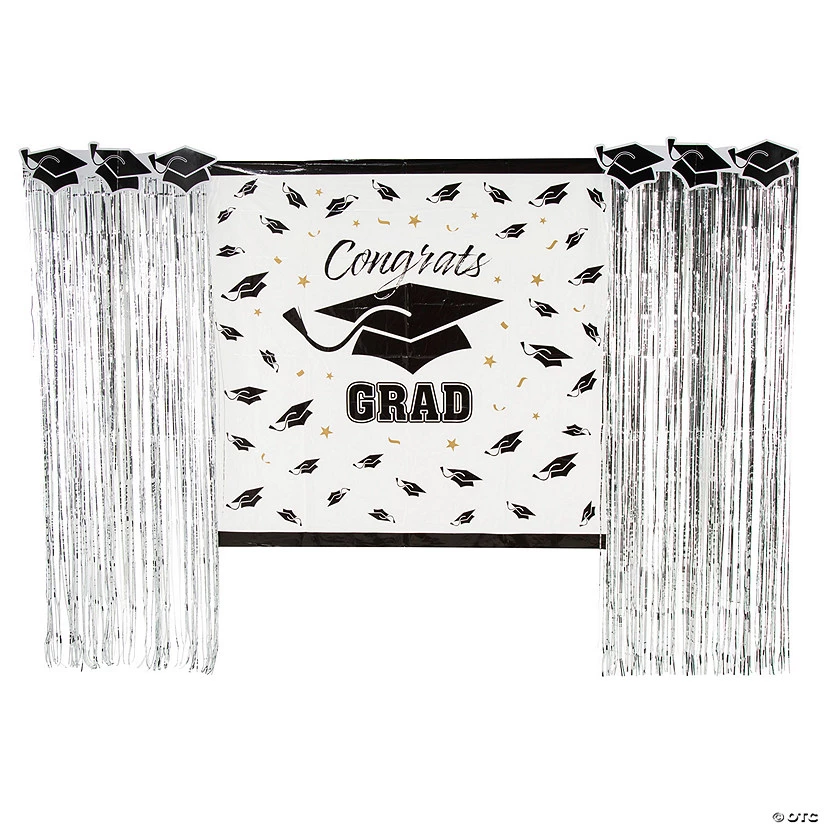 Make sure everyone gets a great photo with the grinning graduate in front of this amazing photo booth set! Add this kit to your graduation party supplies and set it up near the gift table or the spot where the graduate is holding court. Check out more grad party supplies and decorations elsewhere on this site. (5 pcs. per unit) Simple assembly required. Assortment may vary. © OTCIncludes:• 1 Plastic Backdrop (6 ft. x 6 ft.) • 2 Foil Door Curtains (36″ x 78″) • 2 Cardstock Cutouts (36″ x 11″)