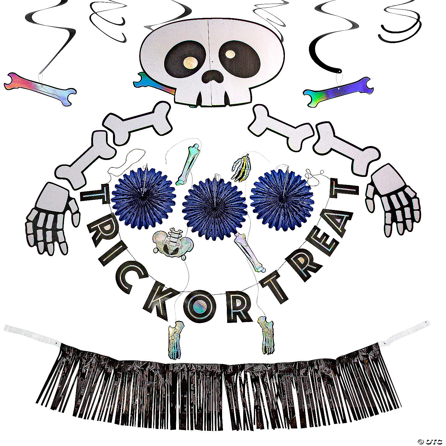 Transform your vehicle’s open trunk into a silly skeleton for a trunk-or-treat event! Featuring skeleton cutouts, foil fringe, hanging swirls and fans along with hanging bones, this decorating kit will help your vehicle stand out at a trunk-or-treat event. Be sure to check out all the great Halloween candy, costumes and giveaways available on this site to complete your trunk-or-treat experience. Paper. Assembled, approx. 60″ x 80″ Simple assembly required.Includes:• 3 Cardstock Hanging Swirls• 3 Cardstock hanging Swirls with Bone Icons• 3 12″ Black Hanging Tissue Fans • 1 Cardstock Skeleton Cutouts Set• 2 Cardstock Hanging Bones• 1 Cardstock Trick or Treat Garland• 1 Paper with metal grommets Black Iridescent Foil Fringe Garland