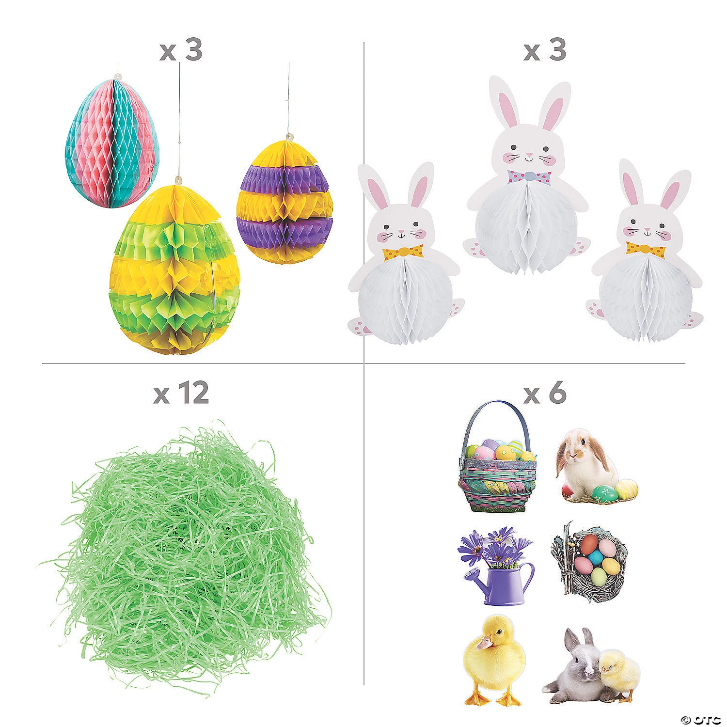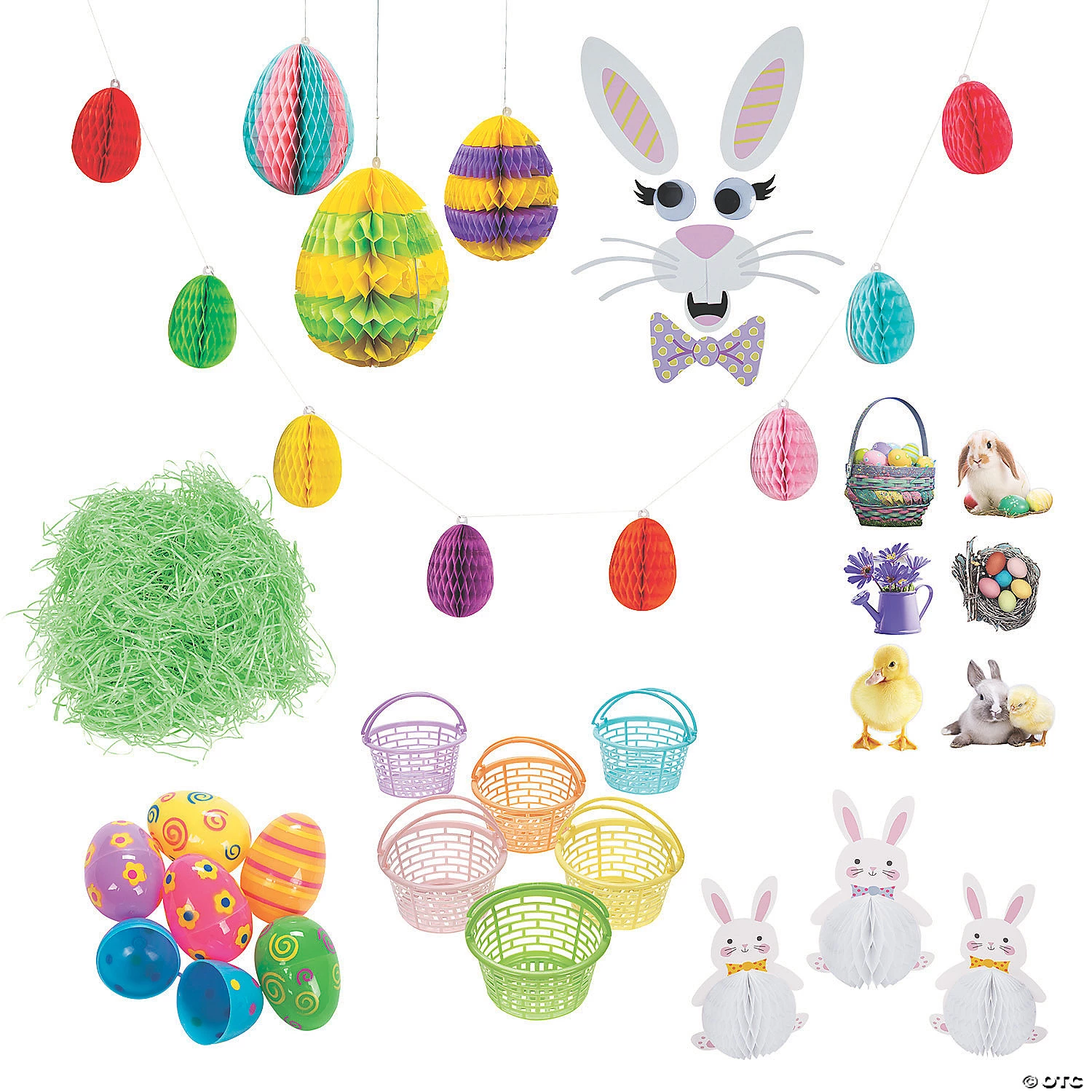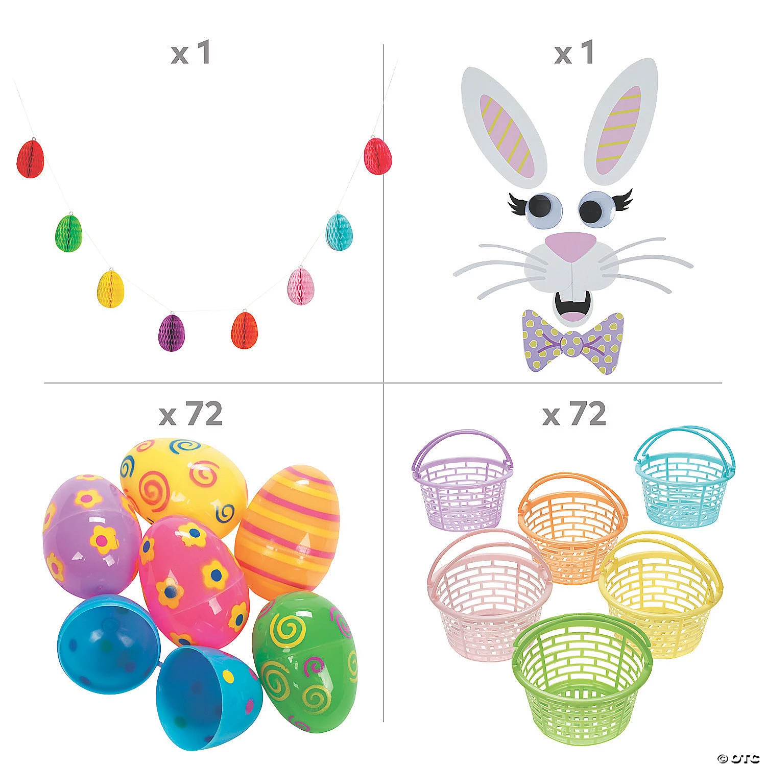 Transform your office or reception area into an egg-cellent Easter wonderland with this kit packed full of bulk Easter supplies and decorations. Greet employees, customers and clients with more than a splash of Easter fun, including plastic Easter eggs, Easter baskets and Easter bunnies. Put it all together, and it’s eggs-traordinary! (110 pcs. per unit) Simple assembly required.