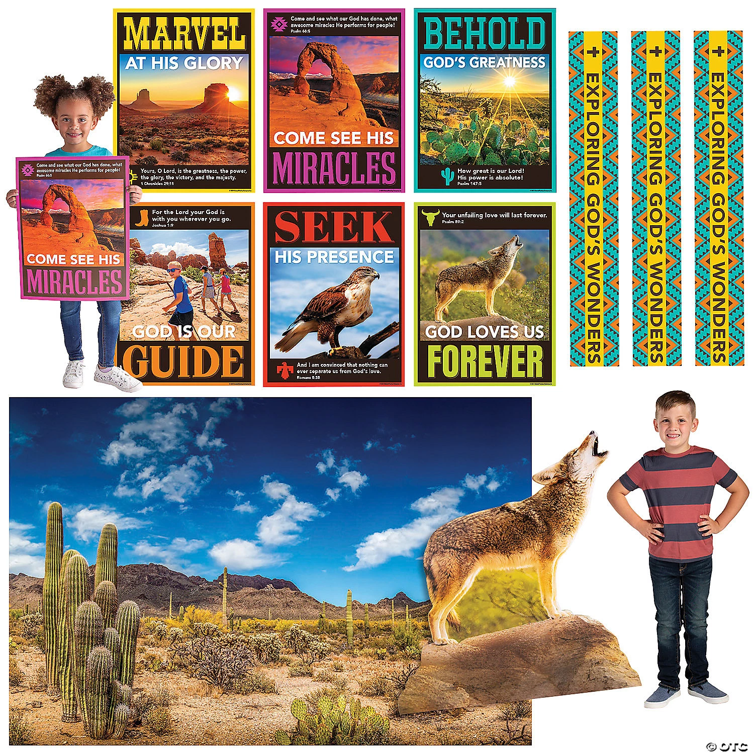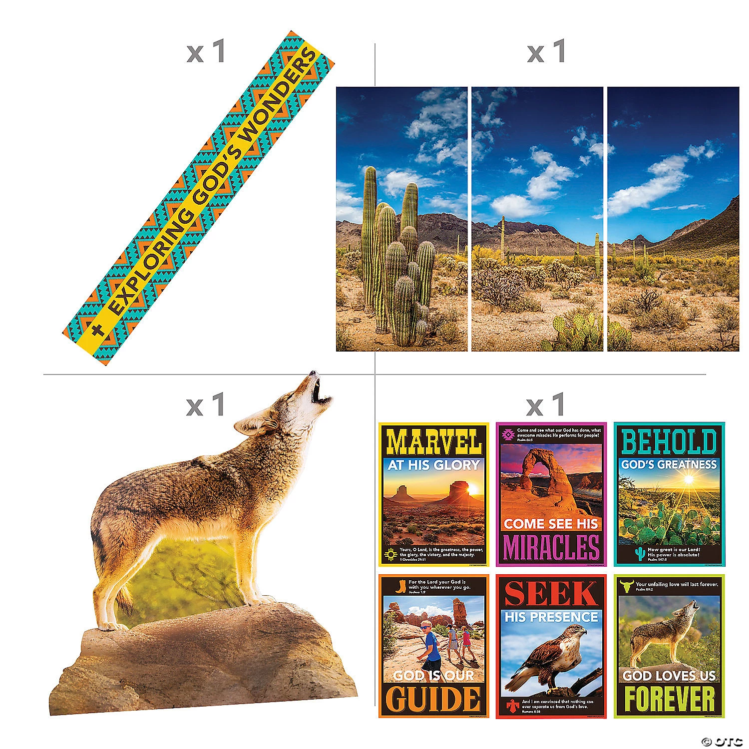 Explore dessert life from the comfort of your Vacation Bible School classroom. This Southwest VBS decorating kit helps students witness the beauty of God’s creations, no matter where in the world you call home! Once your Vacation Bible School week is over, these sturdy decorations can be stored and re-used for other desert-themed lessons and events. (9 pcs. per unit)Includes:• 1 Plastic Southwest VBS Monument Valley Backdrop (Assembled, 9 ft. x 6 ft. Simple assembly required.)• 1 Plastic Southwest VBS Caution Tape (20 ft. x 4 1/2″)• 1 Cardboard Southwest VBS Coyote Stand-Up (39″ x 42″ Simple assembly required. Stand-ups are one-sided with a brown cardboard back.)• 6 Cardstock Southwest VBS Posters (16″ x 20 3/4″)• Assortments are subject to change at any time and may vary from picture shown. Substituted items will be similar in nature.