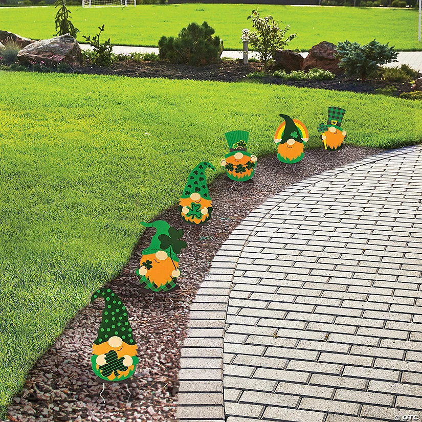 If you’re lucky enough to have a yard full of gnome leprechauns, it must be St. Patrick’s Day! These cute sidewalk signs look like smiling gnomes decked out in green with images perfect for St. Pat’s. Display these outdoor decorations to celebrate the holiday or to let St. Patrick’s Day party guests know where the party’s happening! Corrugated plastic. (6 pcs. per set) 6 1/4″ – 7 3/4″ x 11 1/2″ Includes metal stakes. Single-sided. Simple assembly required. © OTCSt. Pat’s Gnome Sidewalk Sign Instructions