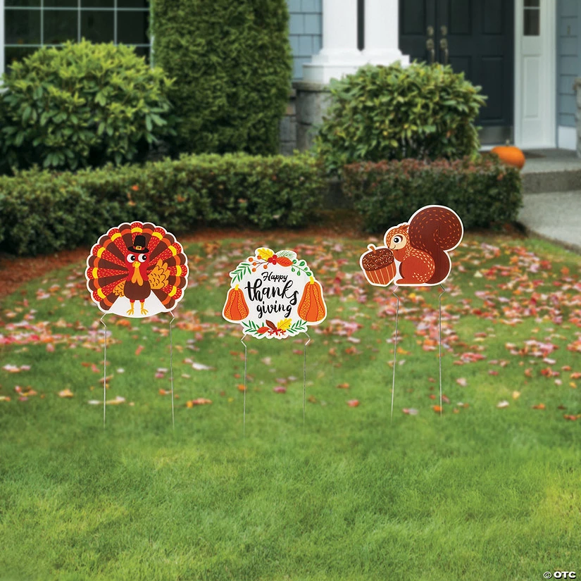 Welcome Thanksgiving guests and add gratitude to your curb appeal with outdoor Thanksgiving decorations for the front yard. These fall-themed signs celebrate the harvest, the colors of the season, and, of course, a lurking turkey, all while sharing Happy Thanksgiving wishes with neighbors, friends and passers-by. Includes metal stakes. Plastic. (3 pcs. per unit) 10″ Simple assembly required.
