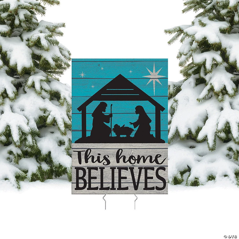Make a statement to your friends, neighbors and passers-by with this This Home Believes Nativity Yard Stake. This sign, which features a silhouette Nativity scene, declares your faith in a pretty way, and it’s durable enough that you can use it year after year. Corrugated plastic. 17″ x 24″ with 22″ metal stakes. Simple assembly required. © OTC