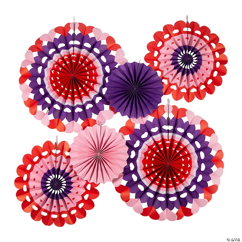 Add some depth and variety to Valentine’s Day party decorations with the help of these colorful hanging fans featuring cutout designs and plenty of Valentine’s Day colors. A great addition to party decorations for a celebration of love, these fans look as great on Valentine’s Day as they do at an anniversary party or rehearsal dinner. Paper. (6 pcs. per unit) Includes two 12″ fans, two 18″ fans and two 24″ fans. Simple assembly required. © OTC