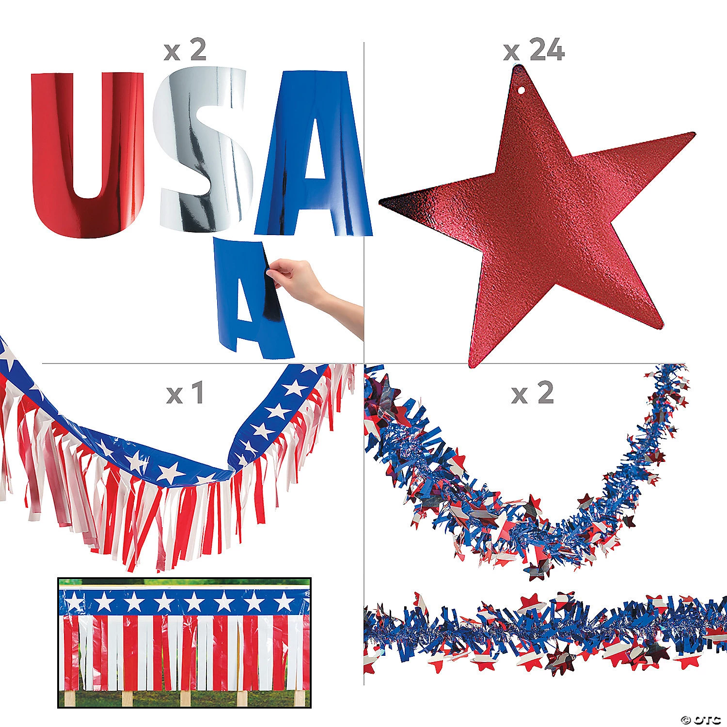 Decorating for a 4th of July parade will be a snap with this convenient decorating kit. This kit includes the perfect red, white and blue decorations to liven up your patriotic themed parade. Hang the decorations from cars, bikes or wagons and watch for the smiles from the crowd! (33 pcs. per unit)Includes:• 24 Cardboard Large Metallic Patriotic Stars (12”)• 6 Cardstock Foil USA Cutouts (7 1/2” – 9” x 12”)• 1 Plastic Patriotic Fringe Garland (100 ft. x 14”)• 2 Foil Patriotic Garlands (24 ft. x 2 1/2”)• Assortments are subject to change at any time and may vary from picture shown. Substituted items will be similar in nature.