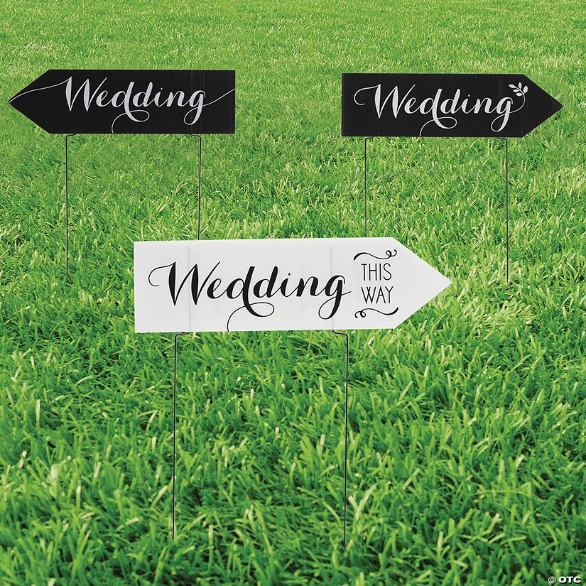 Point guests in the right direction with these double-sided yard signs. Especially helpful if your wedding takes place in a busy neighborhood or if the venue is off the beaten path, these signs will help guests keep from getting lost on their way to the ceremony. Start the wedding decorations before guests even arrive with these helpful yard signs! Plastic. Includes six 22″ metal stakes. (3 pcs. per set) 22″ x 6 1/4″ Simple assembly required. © OTC