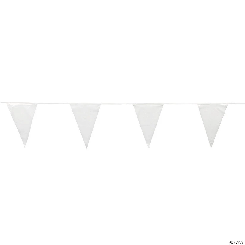 Easily make your party an eye-catching sight with this white pennant banner. This decoration is great for indoor celebrations and can weather outdoor events with ease. Hang it from tents, detail game tables, surround entrances and more! Thanks to the length and durability, you can reuse this pennant banner over and over again for everything from birthday parties to carnivals to sporting events to whatever you need. Plastic. 4 dozen large 17 1/2″ pennants are sewn along 100 ft. of cord.